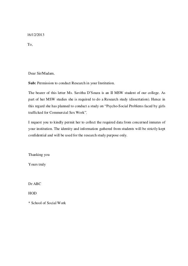A permission request letter for data collection for research is one where someone, such as a college student, is requesting data to complete research work. Letter to authorize research, study or report. To whom it may concern: Writing a letter of permission to conduct research in any organization basically comes in two ways. In addition, the authorities also need to issue specific instructions for the task to be carried out.